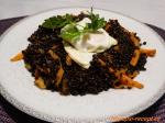 Černá čočka Beluga s mrkví a zázvorem, podávaná s volským okem