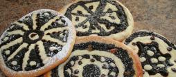 7. Na prostředek dáme asi dvě lžíce tvarohu a rozetřeme po celé ploše. Na uhlazeném povrchu kreslíme povidly a makovou kaší ozdoby. Mák i povidla plníme do sáčků s ustřiženým rohem. Povrch koláče dozdobíme mandlemi a rozinkami. Pečeme v dobře vyhřáté troubě dorůžova.
