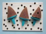 3. Zmrzlé nanuky vysuneme z tvořítek (na 15 s ponoříme do horké vody a pak opatrně vyjmeme) a ihned máčíme v čokoládové polevě.