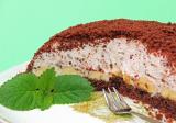 6. Ušlehejte šlehačku s cukrem a ztužovačem do šlehačky, přidejte nasekanou hořkou čokoládu. Náplň navrstvěte na banány a vytvořte kopeček. Navrch dejte rozdrobený vnitřek korpusu.