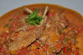 1. Rozehřejte olej na pánvi a osmahněte na něm naporcovaného králíka z každé strany. Maso přeneste do velkého hrnce, přidejte cibuli nasekanou najemno, utřený česnek a papriky nakrájené na plátky. Vařte za stálého míchání.