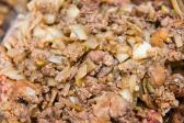 2. Přidáme játra nakrájená na kousky a za stálého míchání smažíme doměkka. Během smažení posypeme kmínem, pepřem a karí.