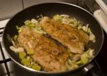 3. Na maso položíme na kolečka nakrájené cibule, pórku a plátky česneku. Chvíli necháme v chladu odpočinout a pak vložíme do trouby vyhřáté na 200°C. Po 20 minutách na každý kousek ryby položíme pár koleček klobásy a ještě 10 minut dopečeme.