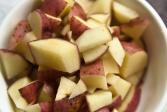 1. Oloupané očištěné brambory nakrájíme na kostičky a dáme uvařit do osolené vody. Žloutek rozkvedláme v mléce.