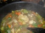 3. Zalijeme studenou vodou, osolíme, opepříme a vložíme do ní mrkev, květák a fazolky. Použijeme-li fazolové lusky sterilované, vkládáme je do polévky až před koncem vaření.