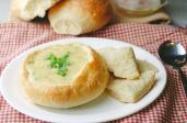 4. Uřízněte horní část chleba a opatrně jej vydlabejte. Pokud chcete, aby byl chleba křupavý, zapečte jej na chvíli v troubě. Poté chleba naplňte polévkou. Tu ozdobte slaninou a lístky koriandru.