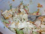 2. Přidáme nakrájené krabí tyčinky a vše spojíme majolkou s trochou bílého jogurtu.
