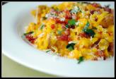 4. Až je rýže měkká, přisypeme hrášek a přepůlená rajčátka. Promícháme a necháme ještě asi 3 minuty povařit. Odstavíme.