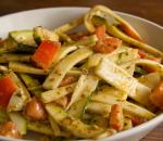Těstoviny s pestem a cuketou. Těstoviny s pestem a cuketou jsme vylepšili o slaninu a cherry rajčátka. Jednoduchý a rychlý pokrm se bude hodit k obědu i k večeři.