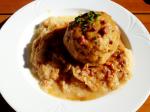 3. Necháme půl hodiny odpočinout. Pak z hmoty vytvarujeme osm kulatých knedlíků - jde to dobře mokrýma rukama - a ty uvaříme buď v osolené vodě nebo v páře. Vaří se 15 - 20 minut.