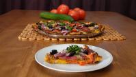 3. Ingredience na pesto rozmixujeme v mixéru. Hotové pesto rozetřeme na pizzu a poté ji dozdobíme zbylými ingrediencemi. Pečeme 20 minut na 200 stupňů.