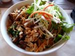 3. Cibulky pokrájíme i s natí a vmícháme do masa. Pánev vytřenou olejem rozehřejeme, vyklopíme na ni maso a za stálého míchání opékáme doměkka. Nakonec osolíme a podlijeme hrnkem vody, ve které jsme rozmíchali solamyl a ještě chvilku povaříme. Podáváme s rýžovými nudlemi.