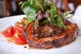 2. Na pánvi rozehřejeme sádlo a kotlety na něm z obou stran prudce opečeme. Pak je pocákáme kečupem, zasypeme zeleninou a podlijeme trochou vývaru nebo horké vody. Pod pokličkou dusíme do změknutí. Na talíři posypeme zelenou petrželkou.