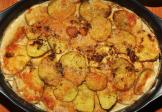 2. Posypeme pokrájenou cibulí, na kostičky nakrájenou cuketou a přikryjeme druhou polovinou brambor. Osolíme, opepříme. Do misky rozklepneme vejce, přidáme smetanu, hořčici, gyrosové koření, osolíme a vidličkou rozšleháme. Tuto hmotu rozetřeme na brambory.
